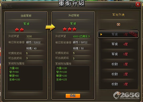 所以,《龙将》中的军衔可不仅仅只是一个空泛的头衔哦!玩家除了可以根据军衔等级领取俸禄和获得属性加成之外,军衔的等级更影响着玩家可以拥有的武将数量以及战斗时可以出战的武将数量。想要提升自己的战斗力拥有最强佣兵团,就抓紧时间多拿声望,努力提升你的军衔等级吧!