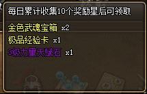 ①每日累计收集10个奖励星后可领取:金色武魂宝箱x2、极品经验卡x1、3级力量天赋石x1。