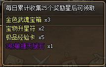 ②每日累计收集25个奖励星后可领取:金色武魂宝箱x3、极品经验卡x5、3级敏捷天赋石x1。