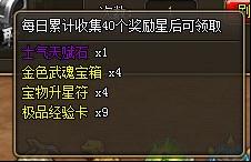 ③每日累计收集40个奖励星后可领取:士气天赋石x1、金色武魂宝箱x4、宝物升星符x4、极品经验卡x9。