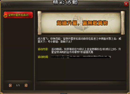 活动内容:活动期间,玩家等级在70级以上且宝物等级在3阶或以上时,升星宝物消耗的的金币将享受7折超值优惠
