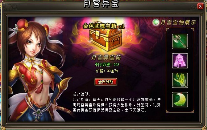 7.除此之外,玩家还可以额外花费金币领取月宫异宝,金币领取999次,每次只需99金。每次购买消耗的金币是固定的。