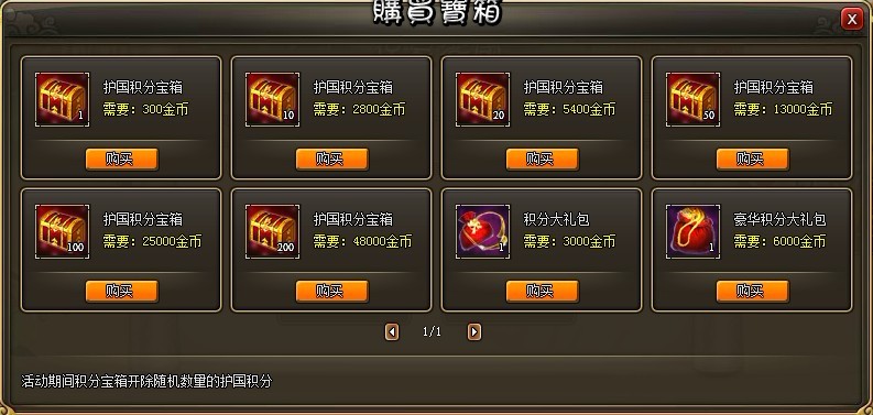 8.活动界面也可以用金币购买积分宝箱,宝箱内含护国积分和大量的道具奖励。