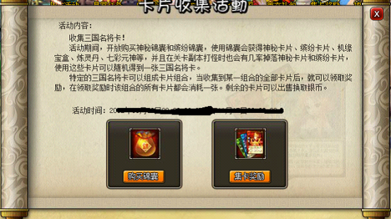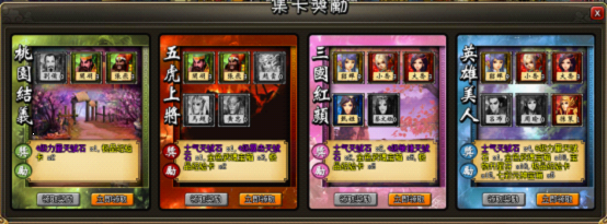 特殊说明:使用神秘锦囊或者缤纷锦囊,分别可以获得“神秘卡片”和“缤纷卡片”。使用神秘卡片后可随机获得一张“桃园结义”、“五虎上将”组合中的三国名将卡。