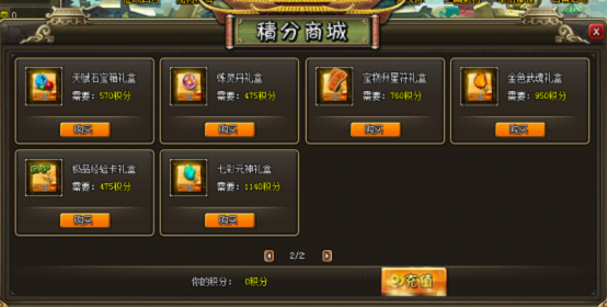 【活动内容】:活动时间内,根据玩家单笔充值的额度,赠送对应比例的积分,积分可以在积分商城中购买珍贵道具。