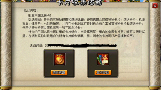 活动内容:活动期间,开放购买神秘锦囊和缤纷锦囊,使用锦囊会获得神秘卡片、缤纷卡片、机缘宝盒、炼灵丹、七彩元神等,并且在关卡副本打怪时也会有几率掉落神秘卡片和缤纷卡片。使用这些卡片可以随机得到一张三国名将卡。