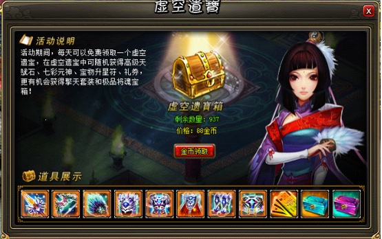 活动期间,每天可以免费领取一个虚空遗宝,在虚空遗宝中可随机获得高级天赋石、七彩元神、宝物升星符、礼券,更有机会获得120级擎天稀有套装和极品将魂宝箱!玩家也可花费金币领取虚空遗宝,每天最多可领取999次。