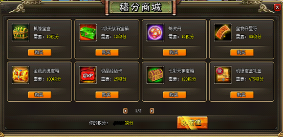 活动时间内,玩家使用金币进行宝物升星和兽灵修炼可获得消耗金币35%的积分返还(返还的积分向下取整),使用积分在游戏界面消费积分商城兑换极品道具!
