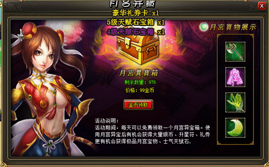 1. 除此之外,玩家还可以额外花费金币领取月宫异宝,金币领取999次,每次只需99金。每次购买消耗的金币是固定的。