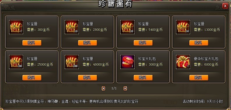 活动内容:活动时间内玩家可以使用金币在活动界面购买珍宝匣,使用珍宝匣以后有几率获得机缘宝盒、金魂、经验卡、珍宝符、银币等!活动时间仅有3天,错过机会不再,赶快行动起来,江山美人尽如怀中!