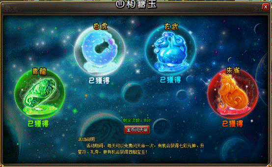 1. 活动期间,每天可以免费问天命一次,有机会获得七彩元神、升星符、礼券,更有机会获得极品宝物四相宝玉!