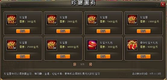 活动内容:活动时间内玩家可以使用金币在活动界面购买珍宝匣,使用珍宝匣以后有几率获得机缘宝盒、金魂、经验卡、珍宝符、银币等!活动时间仅有x天,错过机会不再,赶快行动起来,江山美人尽如怀中!