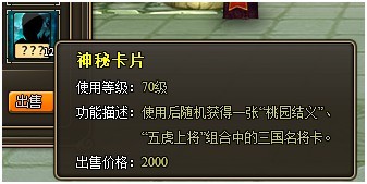 特殊说明:使用神秘锦囊或者缤纷锦囊,分别可以获得“神秘卡片”和“缤纷卡片”。使用神秘卡片后可随机获得一张“桃园结义”、“五虎上将”组合中的三国名将卡。