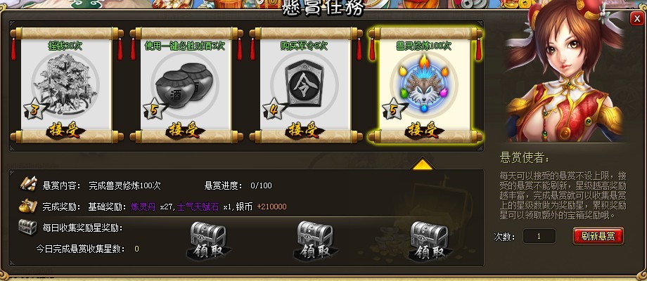4)刷新时会为保留已经接受的悬赏任务,完成高星级的悬赏可以获得更多的奖励哦。