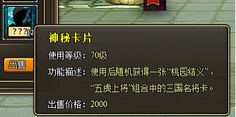 活动内容:活动期间,开放购买神秘锦囊和缤纷锦囊,使用锦囊会获得神秘卡片、缤纷卡片、机缘宝盒、炼灵丹、七彩元神等,并且在关卡副本打怪时也会有几率掉落神秘卡片和缤纷卡片。使用这些卡片可以随机得到一张三国名将卡。