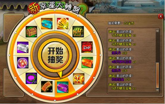活动内容:活动当天玩家可点击游戏中的“新幸运转盘”活动按钮,在打开的活动界面中参与活动,72级以下玩家每次可花费90金币转动转盘,赢取相应的奖励;72级以上玩家每次可花费150金币转动转盘,赢取更高价值的奖励。