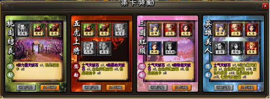 1)特定的三国名将卡可以组成卡片组合,当收集到某一组合的全部卡片后,就可以领取奖励。2)在领取奖励时该组合的所有卡片都会消耗一张。剩余的卡片可以出售换取银币。