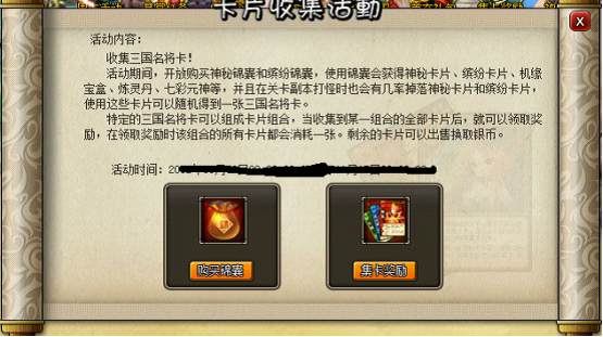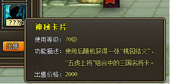 特殊说明:使用神秘锦囊或者缤纷锦囊,分别可以获得“神秘卡片”和“缤纷卡片”。使用神秘卡片后可随机获得一张“桃园结义”、“五虎上将”组合中的三国名将卡。