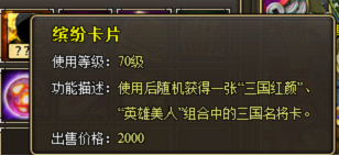 特殊说明:使用缤纷卡片后可随机获得一张“三国红颜”、“英雄美人”组合中的三国名将卡。
