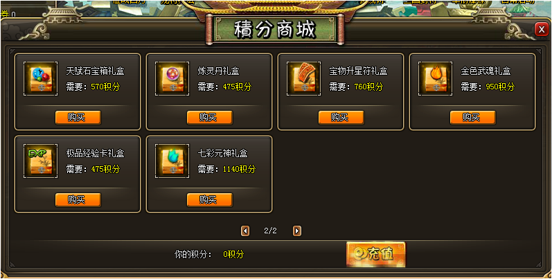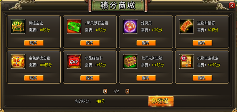 【活动内容】:活动时间内,根据玩家单笔充值的额度,赠送对应比例的积分,积分可以在积分商城中购买珍贵道具。