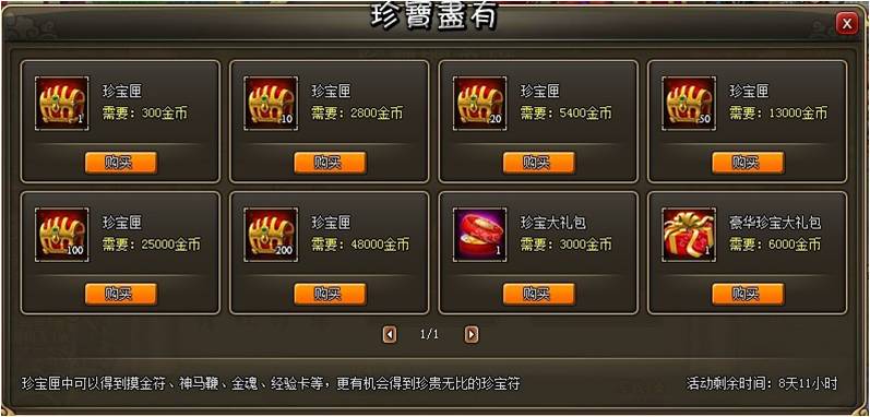 活动内容:活动时间内玩家可以使用金币在活动界面购买珍宝匣,使用珍宝匣以后有几率获得机缘宝盒、金魂、经验卡、珍宝符、银币等!活动时间仅有4天,错过机会不再,赶快行动起来,江山美人尽如怀中!