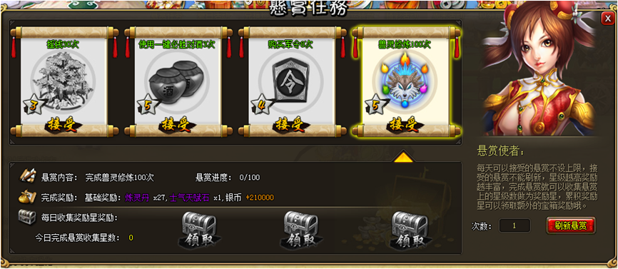 4)刷新时会为保留已经接受的悬赏任务,完成高星级的悬赏可以获得更多的奖励哦。