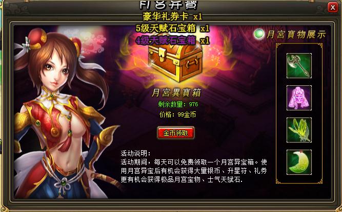 活动期间,每天可以免费领取一个月宫异宝箱,使用月宫异宝有机会获得大量银币、升星符、礼券,更有机会获得极品月宫宝物、士气天赋石!