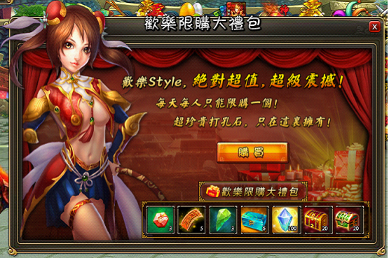 活动介绍:全服所有玩家在活动期间可每天购买一个超值限量大礼包。欢乐Style,绝对超值,超级震撼!超珍贵打孔石,只在这里拥有!每天限购一个哦。