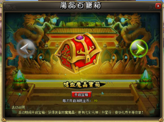 1.活动期间开启宝箱,获得装备附魔魔晶,更有七彩元神、升星符、豪华礼券卡等你拿!
