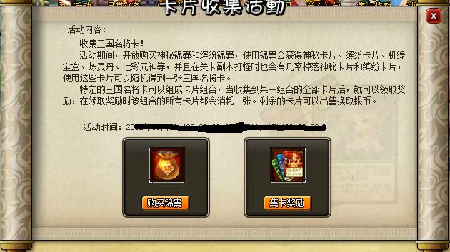 活动内容:活动期间,开放购买神秘锦囊和缤纷锦囊,使用锦囊会获得神秘卡片、缤纷卡片、机缘宝盒、炼灵丹、七彩元神等,并且在关卡副本打怪时也会有几率掉落神秘卡片和缤纷卡片。使用这些卡片可以随机得到一张三国名将卡。