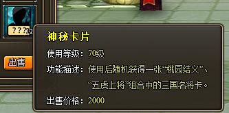 特殊说明:使用神秘锦囊或者缤纷锦囊,分别可以获得“神秘卡片”和“缤纷卡片”。使用神秘卡片后可随机获得一张“桃园结义”、“五虎上将”组合中的三国名将卡。