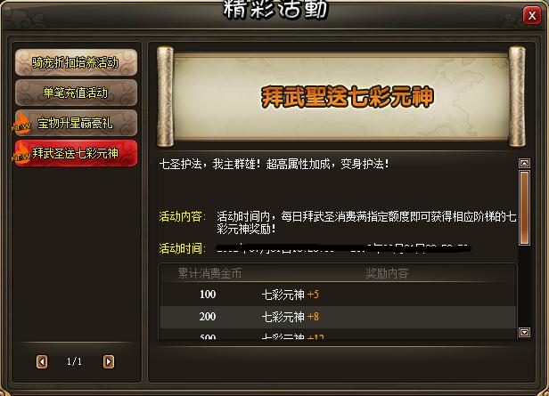 活动内容:活动时间内,每日拜武圣消费指定额度即可获得相应阶梯的七彩元神奖励!
