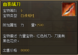 Ø 血影战刀:力量宝物,红色战刀,刀面有黑色花纹。◆新九阶宝物震撼来袭,神器在手,天下我有!(目前唯一的获得途径是遗迹寻宝玩法。)