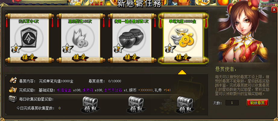 4)刷新时会为保留已经接受的悬赏任务,完成高星级的悬赏可以获得更多的奖励哦。