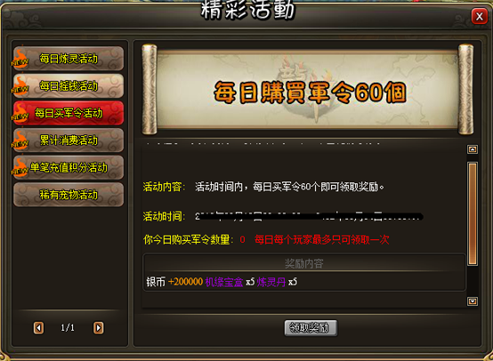 活动内容:活动时间内,每日买军令60个即可领取奖励。