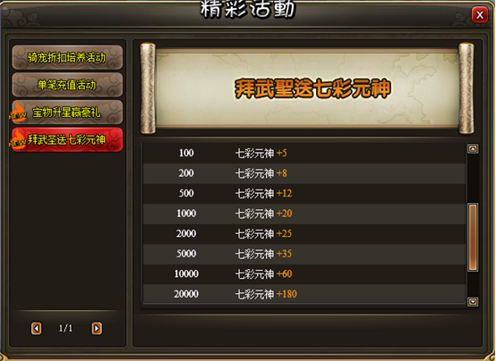 活动内容:活动时间内,每日拜武圣消费指定额度即可获得相应阶梯的七彩元神奖励!