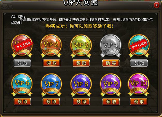 4. 每天的VIP奖励,在活动界面领取。如果当天的奖励没有上线领取,则在第二天只能领取漏补发离线奖励。不同等级钻石卡离线奖励不同。