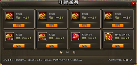 活动内容:活动时间内玩家可以使用金币在活动界面购买珍宝匣,使用珍宝匣以后有几率获得机缘宝盒、金魂、经验卡、珍宝符、银币等!活动时间仅有3天,错过机会不再,赶快行动起来,江山美人尽如怀中!