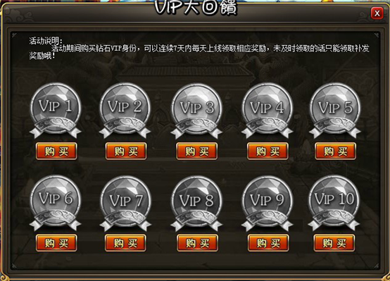 2. 只能使用金币购买的VIP钻石卡向下兼容,也就是高等级VIP可以购买低级VIP钻石卡,并且可以同时购买不同等级的VIP钻石卡。