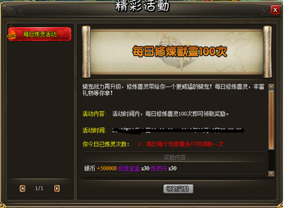 活动内容:活动时间内,每日修炼兽灵100次即可领取奖励