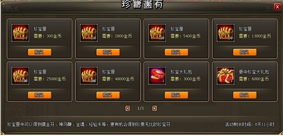 活动内容:活动时间内玩家可以使用金币在活动界面购买珍宝匣,使用珍宝匣以后有几率获得机缘宝盒、金魂、经验卡、珍宝符、银币等!活动时间仅有3天,错过机会不再,赶快行动起来,江山美人尽如怀中!