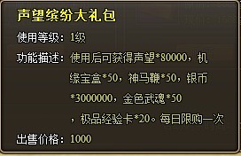 声望缤纷大礼包:使用后可获得声望*80000,机缘宝盒*50,炼灵丹*50,银币*3000000,金色武魂*50,极品经验卡*20。