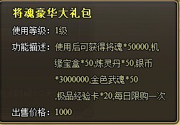 将魂豪华大礼包:使用后可获得将魂*50000,机缘宝盒*50,炼灵丹*50,银币*3000000,金色武魂*50,极品经验卡*20。