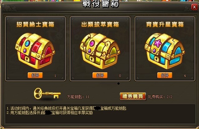 ◆活动开启时间内可在战役限时宝箱面板花费100礼券购买,每天可用礼券购买两次;