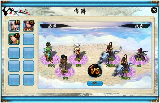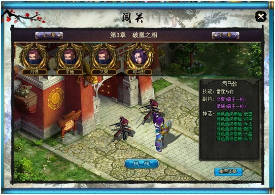 3. 按章节开放所需上阵武将(最多依次上阵3人),上阵武将进行一一比试;玩家出战前可调整上阵武将和顺序,开始后按顺序自动战斗