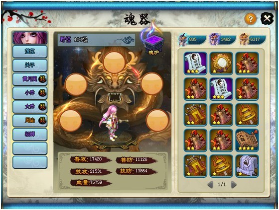 每个武将有五个装备位,分别在40、50、60、70、80级解锁,每个部位可以安装上一件不同类型的魂器。