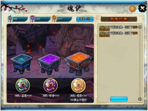 点击魂炉进入魂炉界面,可通过消耗不同品质的将魂来获得对应的魂器。其中橙色魂器可以用黄金来代替橙魂消耗获得。