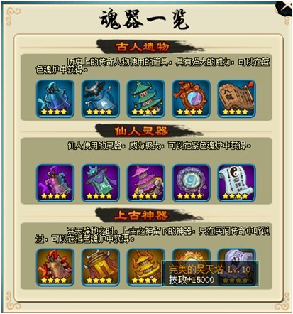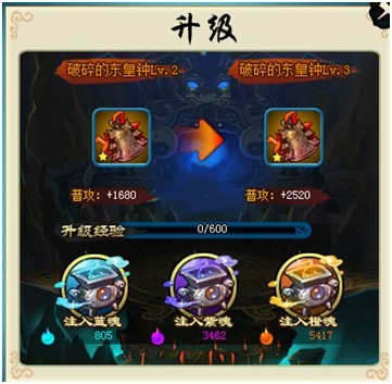 升级魂器需要喂养将魂,每点蓝、紫、橙将魂均提供1点经验,每个魂器都可以提升等级,共有10级。