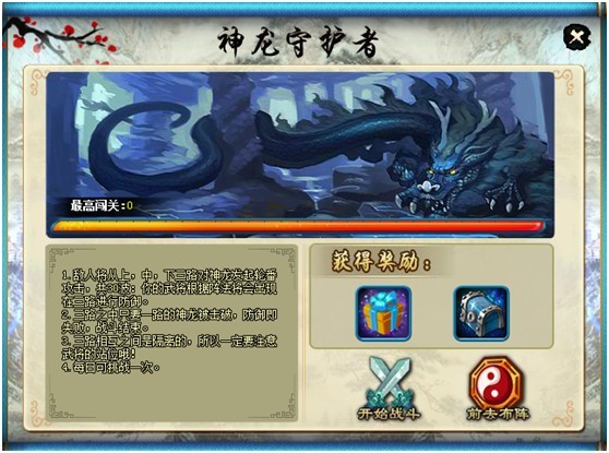 胜负:当任何一路的神龙被怪物击杀后,神龙守护战失败,本次游戏结束。30波怪物全部被击杀后,神龙守护战成功,本次游戏结束。战斗结束后统一进行奖励结算