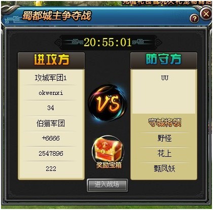 活动当天,系统会算出全服军团总战斗力,并公布进攻方军团及防守方的守城将领,可以通过界面上城主战按钮点击查看,倒计时结束进入战场开始活动。